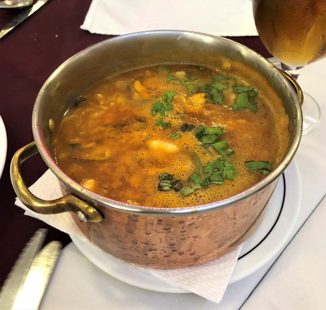 一大铜锅,满满当当,点缀几片香菜样绿叶,初看以为是汤,其实是一锅海鲜饭,只是非同以往所见之模样。
