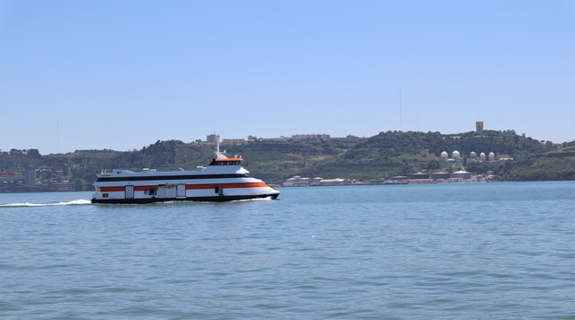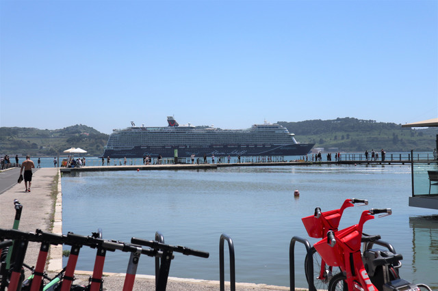 特茹河上缓缓驶过一艘巨大的邮轮,里斯本也是地中海航线邮轮的探访胜地之一。