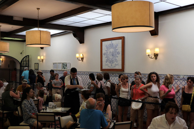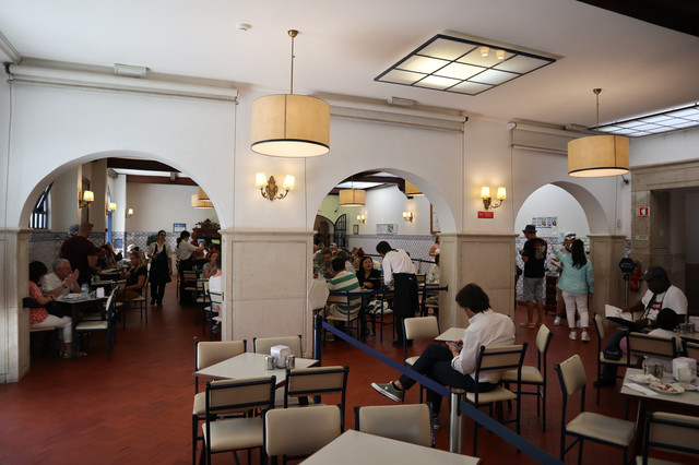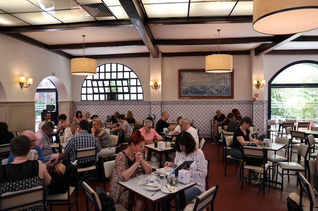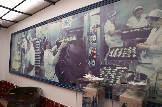 这便是1837年开业的世界上第一家蛋挞店Pastéis de Belém,迄今将近200年,源远流长。但凡来到里斯本的游客必定到此打卡,不光是看,关键是要吃。店门前聚拢着不少人,从门外排队等候进店,果然人气火爆,买卖兴隆。