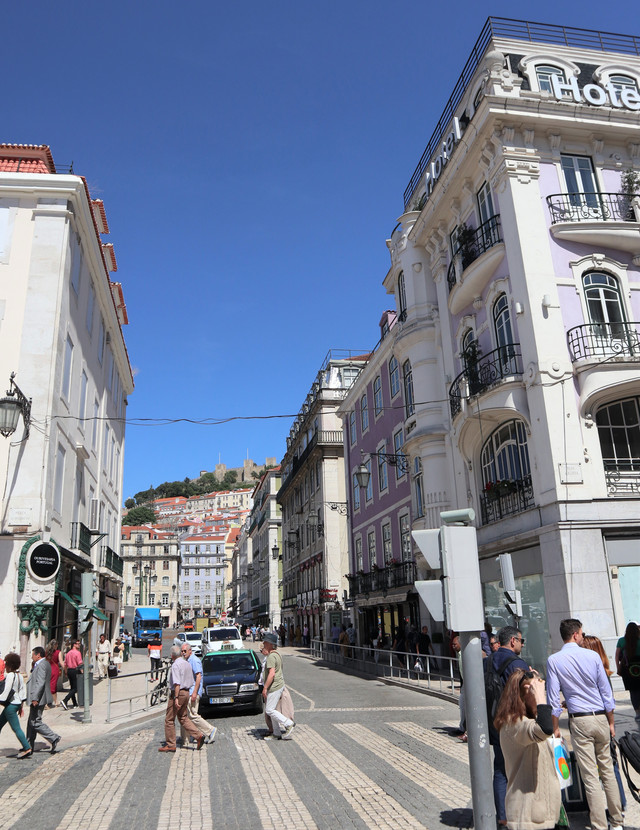 远处山岗上堡垒状的建筑是圣若热城堡,这座始于罗马时代的城堡建筑,可谓里斯本的发源地,整个里斯本老城区就是围绕着城堡逐渐发展起来的。摩尔人入侵后,对圣若热城堡进行了大规模的扩建,厚达8米的城墙至今仍令人感到气势非凡。