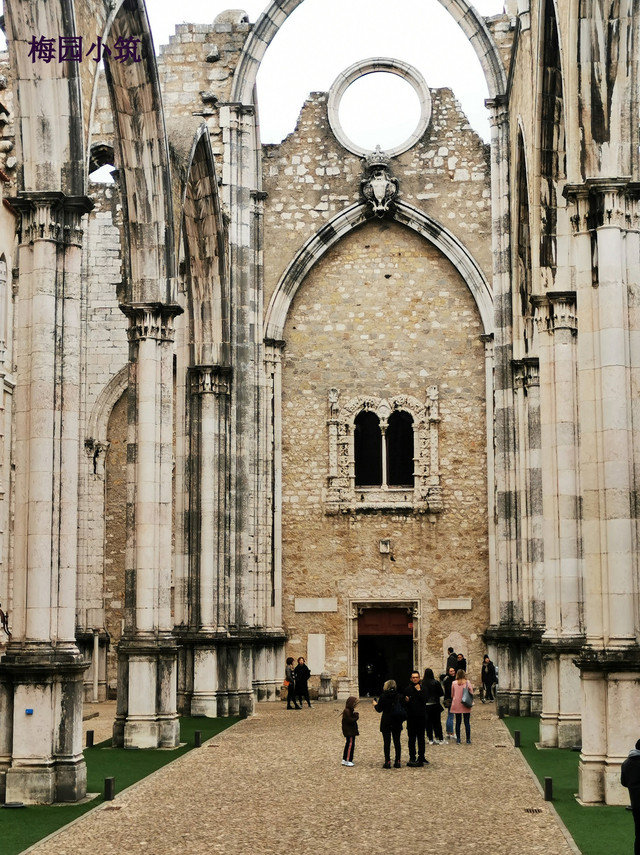 入口处那块被无数游客摩挲得发亮的铜牌上镌刻着:"这里保存着里斯本最深刻的伤痕与最美丽的残缺。"最好的诠释了这一处景观。穿过低矮的拱门,眼前的景象不禁让人屏住呼吸:十四根哥特式肋拱如巨人的肋骨般刺向蓝天,原本应该覆盖着穹顶的空间,现在盛装着里斯本最纯净的天空。地面铺着的碎石保留着地震当时的裂纹走向,那是可以用手指追踪的蜿蜒如河道的裂缝。旁边有导游低声说,这些裂缝被称作"大地的签名"——"1755年11月1日早上9点40分,地球在这里写下了一封我们至今仍在解读的信件"。