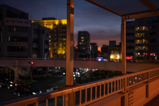 来到过街天桥上,四周的建筑已开始纷纷亮灯。