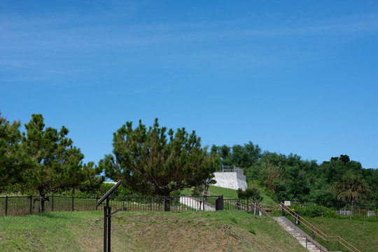 来到栈道边上,视线转向右侧,栏杆前方的远处是美浜公园的中央广场。