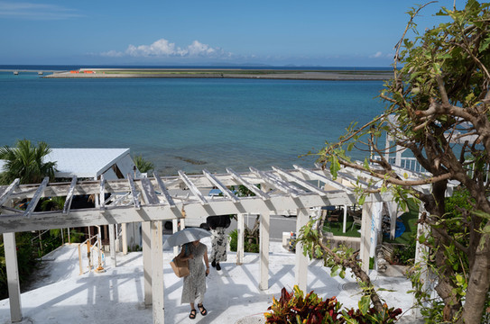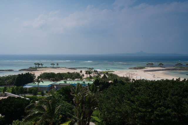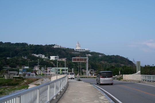 转过头来朝着古宇利岛的方向望去,一栋栋白色的小屋星星点点地镶嵌在这座绿树成荫的小岛上,远方的古宇利海洋塔同样也出现在了视野之中。