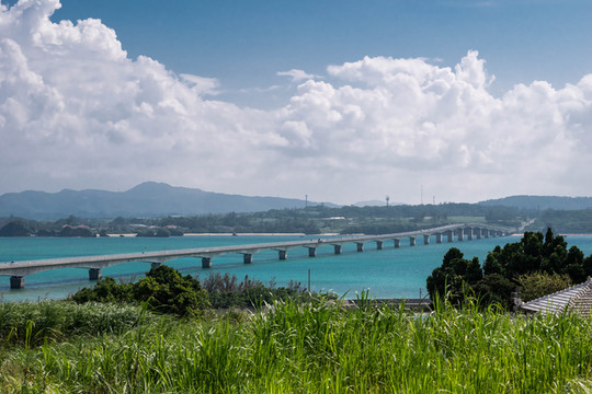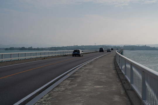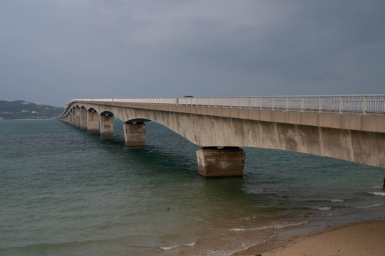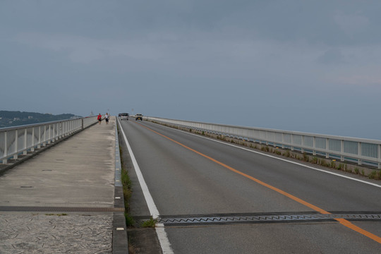 大桥的入口处就在古宇利海滩的旁边,走上步行道后我便开始了我的跨桥之旅。只可惜南边的天空又变得有一些灰蒙蒙的,阳光也没有那么灿烂了,所以那副让人心动的画面也就没有出现了,没事我可以脑补。