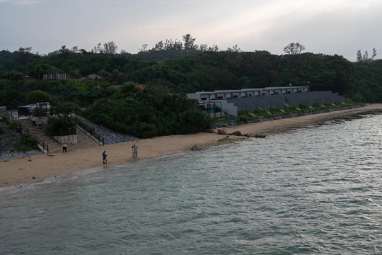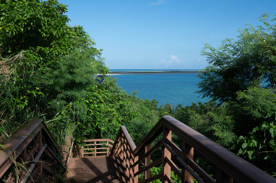 穿过林荫间的栈道来到公路边上,前方蔚蓝的大海一览无余。
