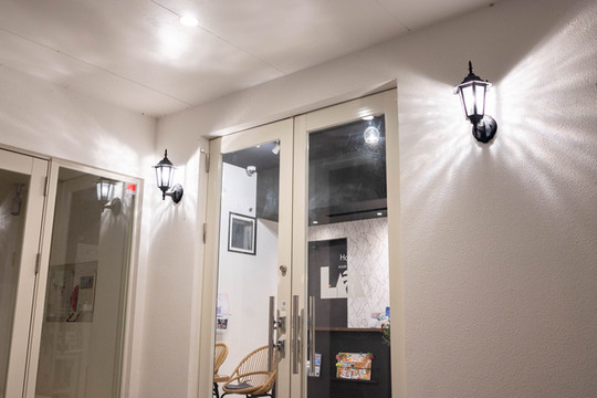 终于回到了酒店面前,看到左边的酒店餐厅里已经有两位游客正在享用烛光晚餐了。