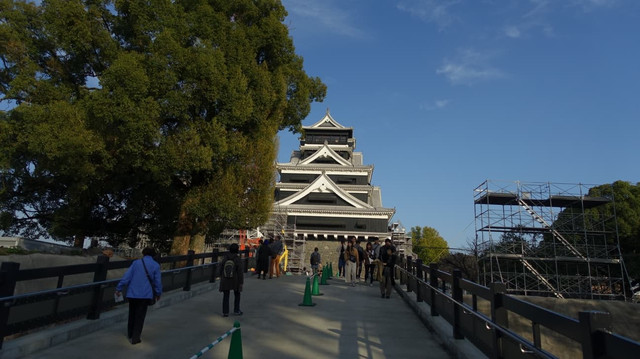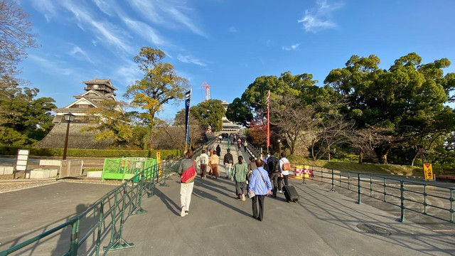 通往熊本城的大桥上,运送着游客陆陆续续的靠近城郭,大家都想看看,这座日本名城恢复的怎么样了。