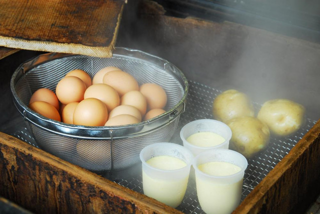 因为是用含有盐分的温泉蒸气一口气蒸成,所以食材本来的美味被完美保留。品味美食的同时还能欣赏美景,甚是惬意。