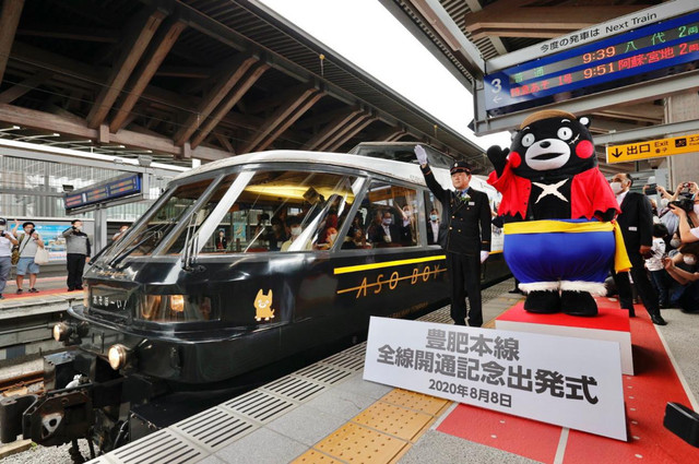 为了庆祝肥萨线恢复开通,8月8日,“老少通吃”的观光列车阿苏男孩!号作为代表列车,在熊本县知事和熊本熊的见证下举办了发车仪式。有着超豪华全景车头席位、和软萌可爱的亲子座椅的阿苏男孩!号,带着兴奋不已的乘客们开启久违的新旅程。
