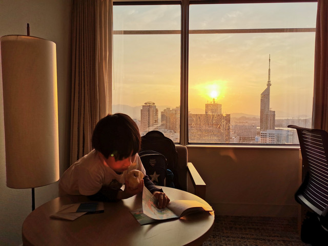 1. 福冈机场有直接到希尔顿的大巴。网上查不到,但是机场确实有。我们来的前9天等待租房子的时候住在这里。大厅,以及一楼就是一个购物中心啊,衣服,包包,玩具,药妆,便利店,高级到普通都有啊。四楼的餐厅那真的是很巨大,顶棚超级高,超级开阔,又能看见海,对于我这种喜欢大气的女子来说,那真的是喜欢的不要不要的。只是房间嘛我们定的普通双床房,大小一般,在日本算是大的了,跟我们国内一些五星级比可能不是那么大。但是很干净。有游泳池,健身房。房间就能看见海或者福冈塔。整体建筑外形项一个楔形,冲着海的那一侧跟刀刃那么锐利的感觉,让我这个文盲每次都想起来乘风破浪这个成语。还有下午茶别错过啊,记得预约啊,实物嘛我太挑剔,没有我在三亚丽思卡尔顿吃的精致,但也很好吃了,视野嘛,不要太完美了,海景一览无余。我跟儿子取的时候正好天气特别好,我的天呢,画中一样。
