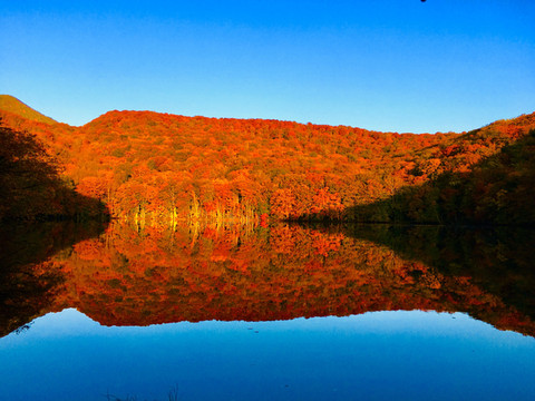 每年的10月中旬至下旬的期间,位于青森县十和田市八甲田山麓的茑沼迎来了最佳的红叶观赏时期——连绵不绝,漫山遍野的红色倒映在清澈透明的水中,如熊熊燃烧的火焰一般,从湖面升腾而起。这是茑沼的绝景,叫坐“茑沼朝烧”。不过想要看到这样的景象可不容易,必须在红叶最盛的10月中下旬,于晴朗的早晨,在日出之时静候阳光普照在红叶上,看层林尽染,倒映在沼泽水面上,形成梦幻至极的镜像美景,令人无比赞叹。