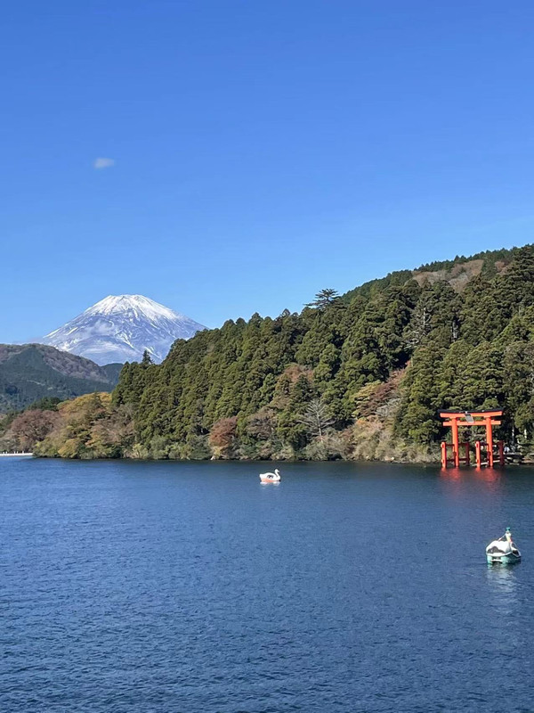 天气实在是太好了,我们在快到达箱根町港时,第一次看到了毫无遮挡的富士山,很激动,富士山的形状非常完美,无遮挡看起来就格外壮观.在快到元箱根港时,拍到了富士山和水中神社的二合一完美组合!不虚此行啊!