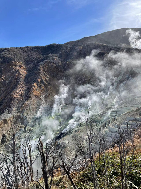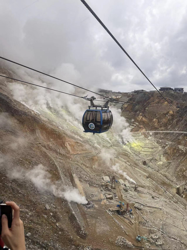 小田急线终点小田原后换乘往箱根汤本的列车,到站后转乘登山电车到宫之下,因为有周游券,你可以看到好的风景就随时自由上下车.不会错过任何美景.因为我订了桃源台的酒店,所以出游的方向就那里,首先是换乘缆车去大涌谷.缆车先是在树林上方前行,突然就可以看到左手方向的地貌陡然改变,浓烟滚滚,往下看原来是硫磺谷,谷里遍地都是燃烧着浓烟的硫磺洞,那情景恍惚让人置身于人间地狱一般,很震撼.