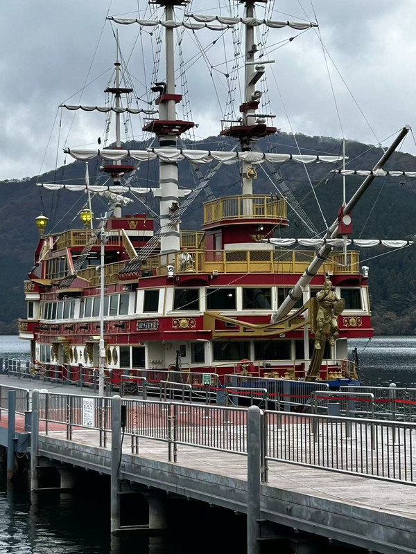 再乘缆车就可以到桃源台了,因为时间尚早,我们的酒店下午3点才能办入住,所以在桃源台乘海贼船游览芦之湖全景.因为有周游券,所以每个停靠点都随意下来,看看美景,当天天气不太好,在箱根町港没能看到富士山.在元箱根港看了水中神社,这个拍照打卡点人气太旺,排队排到半山腰.