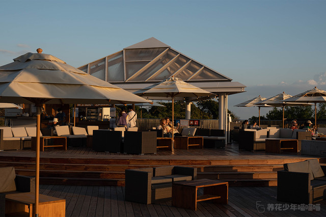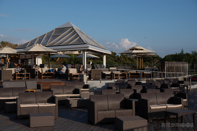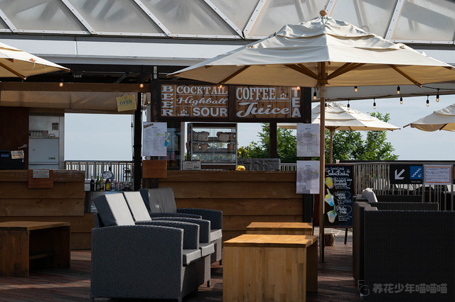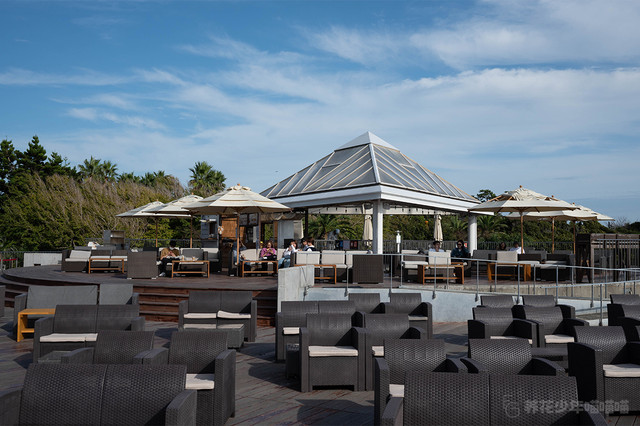 二楼露台上放置着许多白色遮阳伞和舒适的沙发,即使在广阔的江之岛,这里也是很值得推荐的放松身心地方。