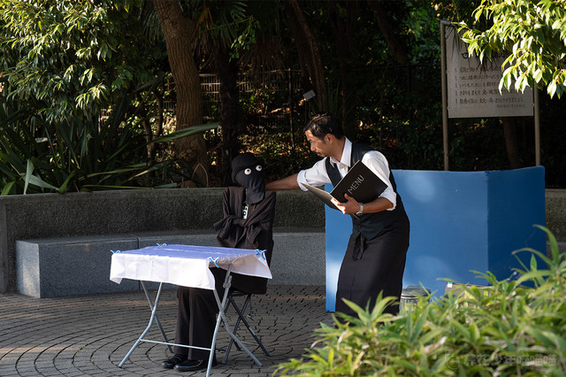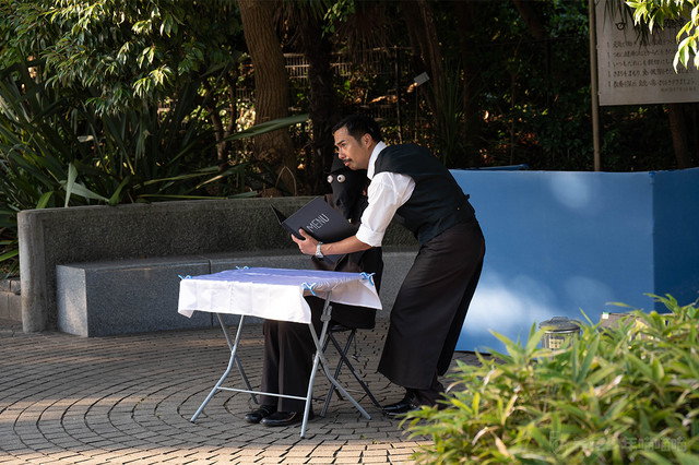 旁边的街心花园里,一位大叔正在表演一场默剧,这位服务员装扮的大叔正在给座位上的假人点餐,吸引了不少游客在一旁驻足观看。