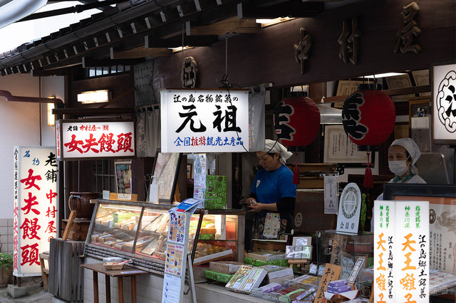 弁天桥的尽头就是江之岛本岛,映入眼帘的是一条特别有历史感的商业街。街上叫卖的小贩,古朴的怀旧店铺,特色印花手工店…仿佛时光在这里停止,好似百年前就是这般模样。