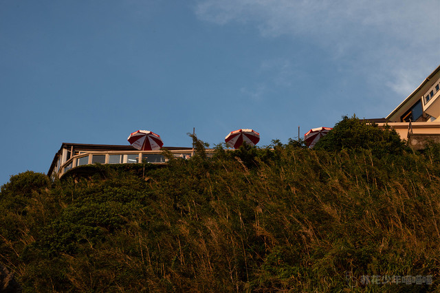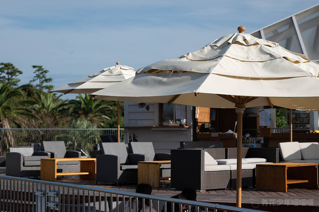 海滩度假村般的露台,白色的遮阳伞映衬着蔚蓝的大海。