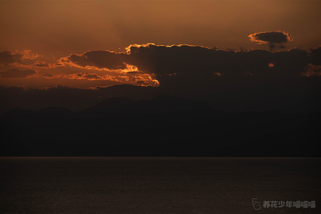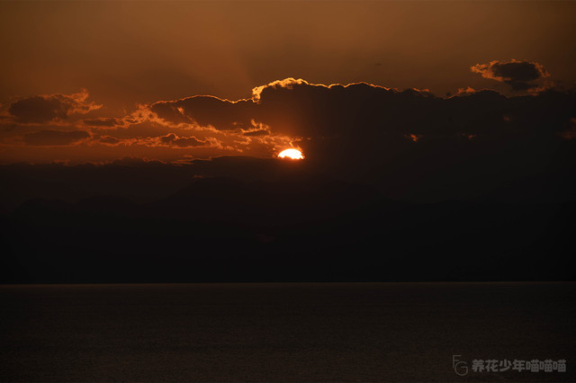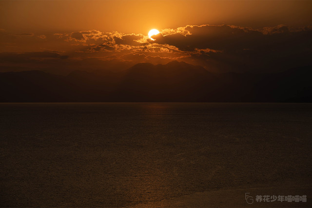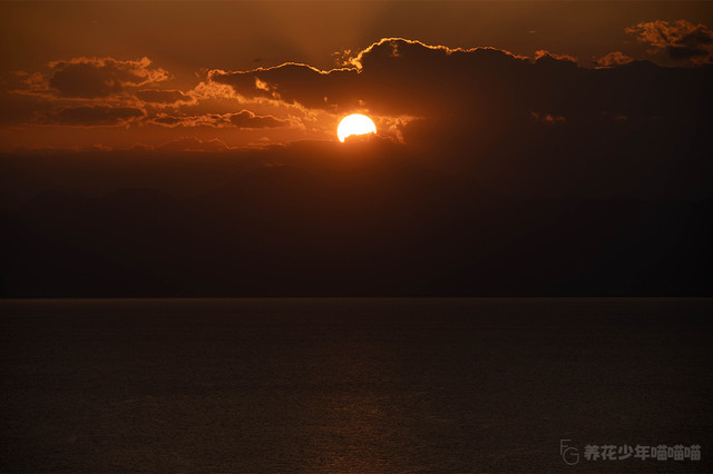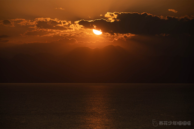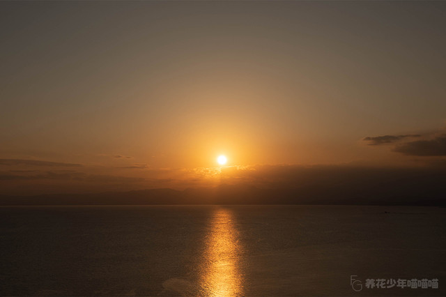 视线从上往下,被霞光染红的天空、隐于远处的山峦、散发亮光的红日、波澜涌动闪耀着光泽的海水,组合起来恰似一幅印象派绘画大师的佳作。