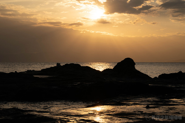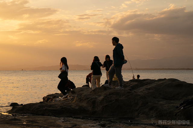 夕阳落下,金粉色的阳光铺满沙滩、海湾,还有小岛。远方金灿灿的海岸线与江之岛遥相呼应,形成了一道绝美的风景线。