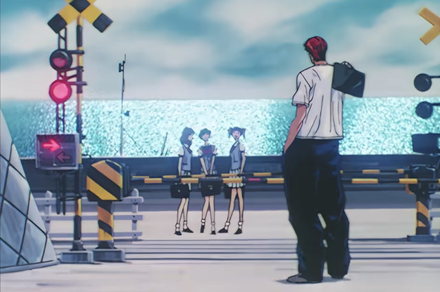 除了动画片头曲中樱木跟晴子打招呼的一幕之外,其实在漫画中也出现过这个道口的实景。从一开始湘北对陵南的练习赛结束离开的时候,到全国大赛开始前流川枫找仙道单挑的时候,都是发生在这个平交道口。