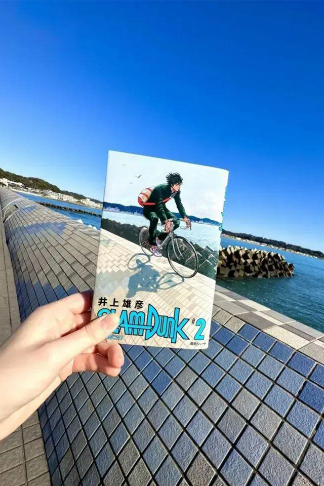 在漫画新装版第2期的封面中,流川枫骑单车的海边堤防就是这里。