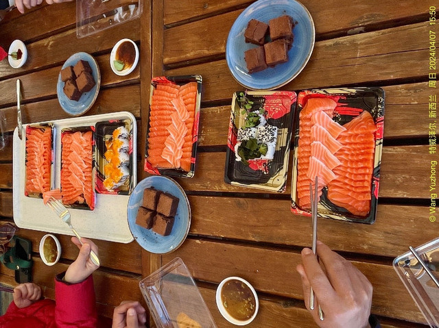 游完 塔斯曼 冰川湖,开车直奔特威泽尔的国宴三文鱼餐厅High Country Salmon,这里的三文鱼非常著名,据说:”来到 新西兰 南岛 ,不来这家吃三文鱼,白来一趟 南岛 游“。这家店也是网红店,人超多,营业时间短,下午5点关门,4点以后不保证还有三文鱼。好在我们赶得及时,买了足够的三文鱼,在餐厅外面阳伞下,美美的饱餐一顿,让味蕾得到了极致的满足。