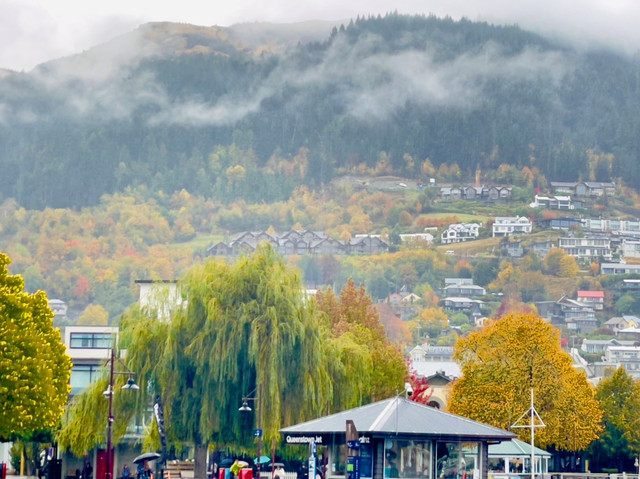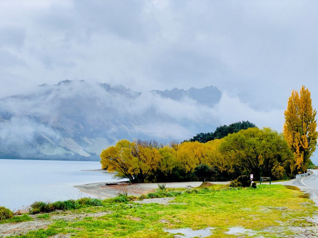 在酒店餐厅吃过早餐后,我们不能放过再次品尝生蚝的机会,便去了Barnes Wild Bluff Oysters买了三盒(12只)新鲜的大生蚝准备晚饭吃(齁咸,用清水冲洗过后才是真的美味)。随后,踏上了前往 皇后镇 的旅途,一路上湖光山色,美不胜收。秋天的山景色彩斑斓,雨中的瓦卡蒂普湖宛如水墨画一般,令人心醉神迷。