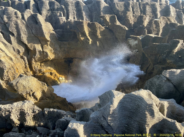 提前半小时结束霍基提卡活动,加了汽油后,继续前进。赶在海潮最高潮的时刻,终于到了 普纳凯基 ,看到了风格奇特的薄饼岩,那里的景色令人震撼,它是一个严重侵蚀的石灰岩地区,主要由一层又一层的博饼状岩石组成,层层叠叠的岩石真的象榴莲千层蛋糕一样,奇形怪状。在著名的喷水洞,澎湃汹涌的海浪从喷水洞喷发而出,气势磅礴,轰隆的雷鸣声震耳欲聋。