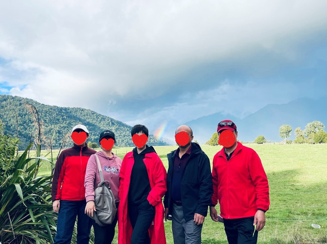 为了欣赏日落时分Lake Matheson绝美的景色,我们远眺完 Fox 冰川,急急忙忙赶往Lake Matheson步道停车场。没想到我们人品爆发,再次看到了象燃烧起来的霓和虹,它是如此的明亮、清晰,七彩的光线就象调色板一样根根分明,朋友们各种拍,眼睛都忙不过来了。按照网友说的,我们赶到马松森 湖西 观景台,才发现,最美的角度是在东观景台,又急急忙忙的赶往东观景台。果然,这里水面如镜,只是山上阴雨天,没有看到远处的雪山白云,确意外收获了绚烂的彩虹,倒影在水面上别有一番意境,一群飞鸟飞翔过来轻轻的滑过水面,真是美极了。随着太阳落山,光线逐渐变暗,期待的晚霞不会再出现了,大家才依依不舍的离开。