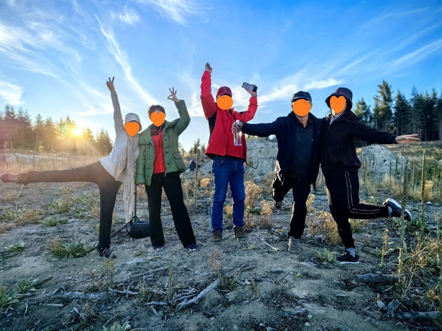 早晨6:40,大家准时集合到eely Point静待日出,虽然 瓦纳卡 镇的上空乌云密布,但东边却是晴空万里,在云与山之间始终留有一条晴朗天空的缝隙。不一会,阳光从缝隙里射了进来,逐渐看到了霞光倒影在湖面上,美不胜收。回头往西看,阳光通过缝隙,在山腰上留下了一条金色的光带,宛如美女的腰带,更显妖娆。随着太阳的升高,腰带慢慢下移,最终照到了湖面,照亮了湖边的杨树,本来就很黄的树叶,更加金黄、浓烈。