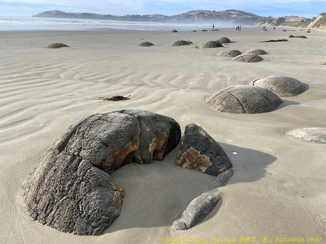 酒店房间里早餐后,上午9:00,出发前往莫埃拉基Moeraki圆石,根据 Oamaru 潮汐数据:Moeraki 04-09 号上午 09:47m, 低潮位 0.4 米,退潮了,大原石全部都裸露出海面,安静的躺在沙滩上等着我们的莅临。车停在私人咖啡厅停车场,并没遇到网友说的收费问题,直接走去沙滩,50多个巨大的圆石露出海面,有的上面布满网状瘢痕,有的已经自然裂开,漏出里面非常坚硬的化石,清晰地向人们展现出内部结果。说他们是石头,不如说它们是巨型石蛋更为贴切,有蛋壳、蛋白、蛋黄,有的象茶叶蛋,有裂开的貌似小鸡已经孵化而出。它的形状之圆,内部结构之神奇,使我们真真切切的看到了那些神奇的圆石的人,都不得不从心底感叹大自然的神奇。