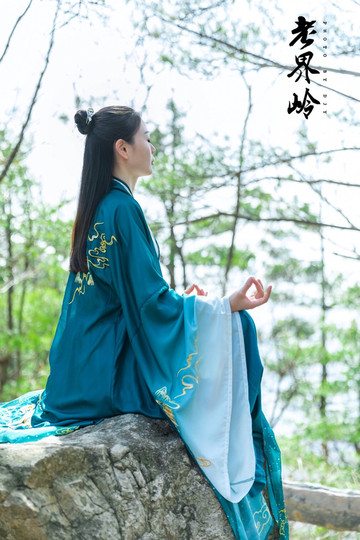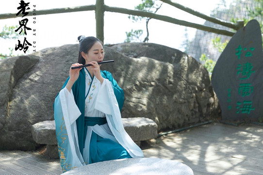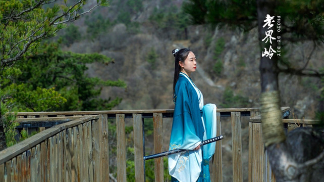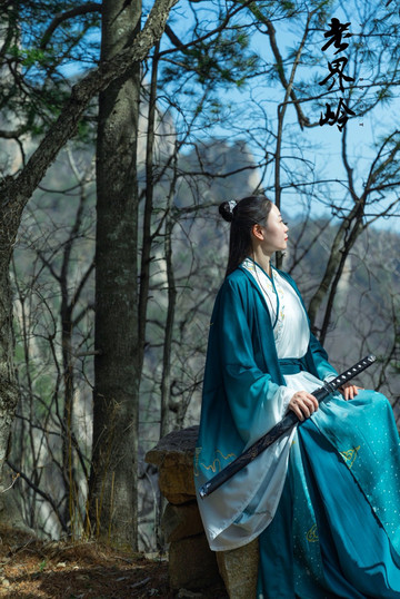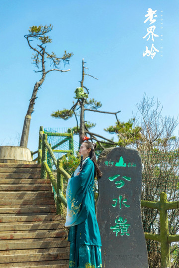 着身古装,行走其间,走累了就停下来歇一歇。看这眼前群山连绵起伏,犹如大海掀动的波澜,天气晴好,此情此景,似一幅清秀的画,如一首深邃的诗。