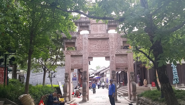 继续行走,可以看到一座图饰古朴典雅的牌坊—“葭萌牌坊”。这座葭萌坊,高8.6米,宽6.8米,气势雄伟,上面的楹联和图案,集中展现了昭化悠久的历史、厚重的文化、独特的交通军事地位和神奇的太极山水。牌坊东面的柱联是“蜀道三国重镇,天下第一太极”。上面刻有“蜀汉兴于葭萌” 、“桔柏古渡”、“山水太极”图案。