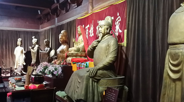 二圣殿中央供奉唐高宗李治和武则天真容铜像。这里讲述了中国历史十分罕见的现象:皇帝和皇后同朝共事,掌握朝政。