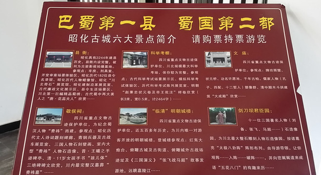 从三国时期刘备入主葭萌到蜀汉灭亡的52年中,刘备、诸葛亮、张飞、马超等众多三国英雄人物曾在昭化运筹帷幄、跃马扬戈,留下了大量的三国蜀汉遗迹。