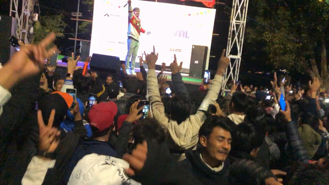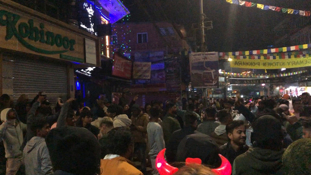 这样的狂欢从晚上7点开始,到夜里12点到达了巅峰。临近跨年,沿街的每个舞台上都表演着压轴的节目,我挤到一处舞台的最前方,融入在当地人中间。这个台上是一个rapper在表演,虽然不懂尼泊尔歌词所传达的意思,但他的灵动变化的flow和底气十足的快嘴,估计放在中国的说唱节目也能随便拿个冠军。所有人在台下肆意的蹦跳,我和周围的人勾肩搭背的跳在了一起。