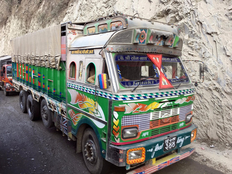 站在路边我观察到了一个十分有趣的现象:尼泊尔当地的卡车都非常有个性。首先尼泊尔的大小汽车基本都是印度进口的,零星能看到几辆丰田汽车,中国车不常见。而卡车有意思的是他们的窗户是印度教风格的拱式窗户,看上去就像一个小佛龛一样,车身上贴满了鲜艳的图案(他们好像对nike的标志性有一种符号崇拜,街上很多车都贴了大大小小的nike标),喇叭的声音也非常独特,改造成了抑扬顿挫音色跳动的旋律,按喇叭时确实少了一份噪音的烦躁。