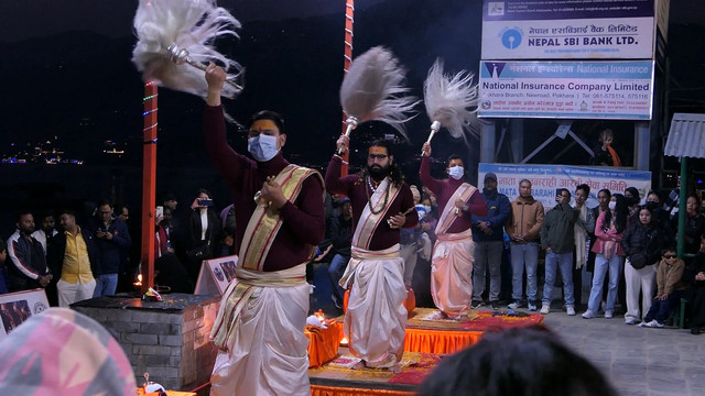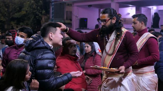 在尼泊尔,有很大一部分人都是以庆典谋生的。尼泊尔每年各种节日多达300多个,少数是全国性节日。几乎每人每年要花三分之一的时间来从事节日活动。新年作为一年的开场,更是汇集了大家对新生活的期盼。步行街上布置了好几处舞台,几乎走两步就会有人用音响放歌曲,音乐一响,周围的路人都会卷入到跳舞的行列里。行人吹着塑料喇叭,向每一个路过的人打着招呼,仿佛有用不完的劲。博卡拉只有20万人口,但感觉所有人都涌上了街头,想象一下北京最拥挤的地铁站的人流量,也不过是此刻街上的平均水平。