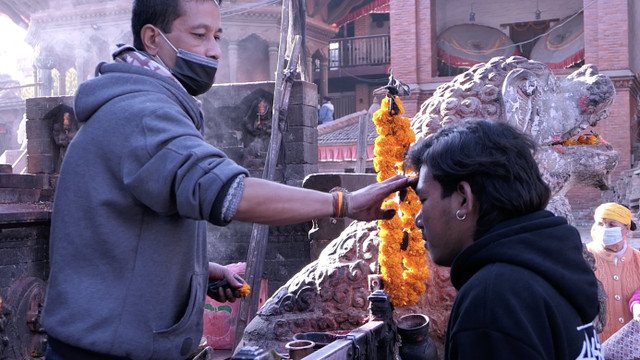 在费瓦湖边举行着当地特有的祭祀仪式,我们也凑凑热闹,随着当地人蜂拥到祭司台下,托起双手索要花瓣和糖,虔诚地让祭司在眉心点上一粒红,当地人称为TIKA,是一种美好的祝福。