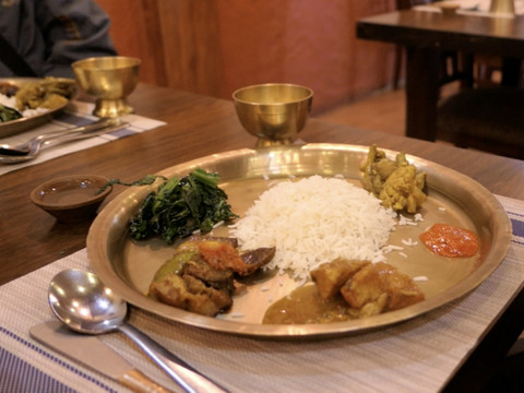 天色渐晚,向导组织我们集合,品尝尼泊尔当地菜。尼泊尔餐叫做达尔巴特(Dal Bhat),由扁豆汤(dal)和米饭(bhat)组成,和印度手抓饭算是一个风格的,但更具有仪式感。在一个很大的铜盘子中央放上米饭,一道玛莎拉风味的主菜,还有一些蔬菜、酸奶、酸辣酱等配菜,当然,其独特之处除了口味,更在于入口方式上,这是一道手抓饭……