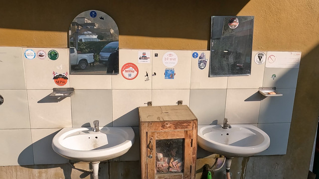 期间我们在中间一个小休息区下来修整,尼泊尔的公共卫生间十分简陋,但门口用来投币收费的玻璃箱子却非常精致,让人有心甘情愿投币的欲望……
