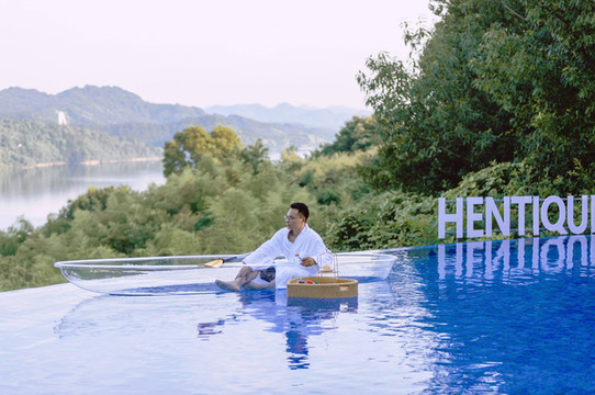 涵田山顶温泉位于青龙山脊,有大小15池温泉及两座木屋及七个休憩亭组成,其中全湖景池9池,山景池6池,大部分池边置有休息凉亭,配以简餐及十多种自制甜品饮料。清澈清凉的山泉水上,最适合撑一条玻璃船了。躺在船上,闭上眼睛感受着泉水的流动,仿佛摇曳在水上。ins风满满的网红透明玻璃船,今夏最热门网红拍照打卡点,让你可以轻松get 到同款,在星空点点的夜晚,纵身跃入泳池,或坐在泳池边看星星,都是一件美好的事情。