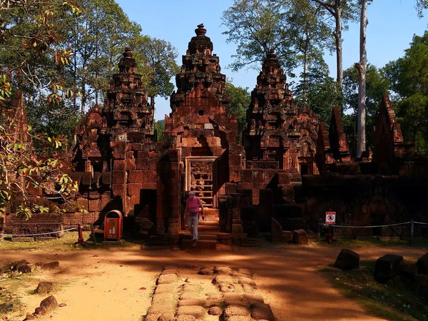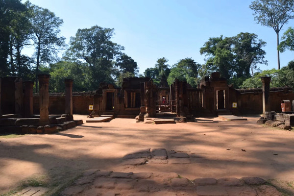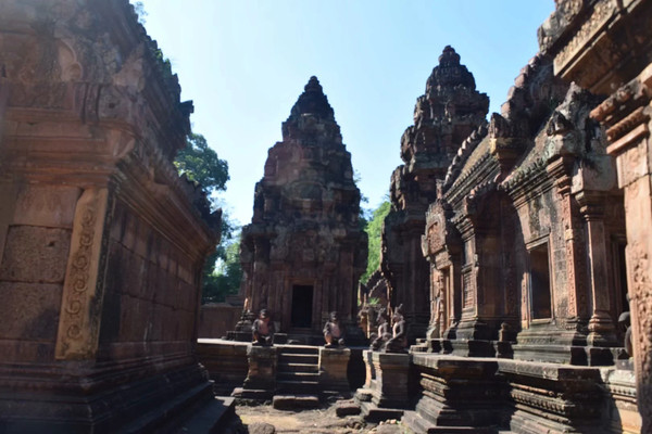 女王宫是王室祭祀自己祖先的地方,整个建筑是印度教风格。这是用当地的红土烧制的砖建造的建筑,虽经过战火的洗劫,整个建筑依然泛着红色,在阳光下非常美丽,建筑上的浮雕也很精美,不禁让人感叹当时这个王室的祭祀场所是非常精致的地方。