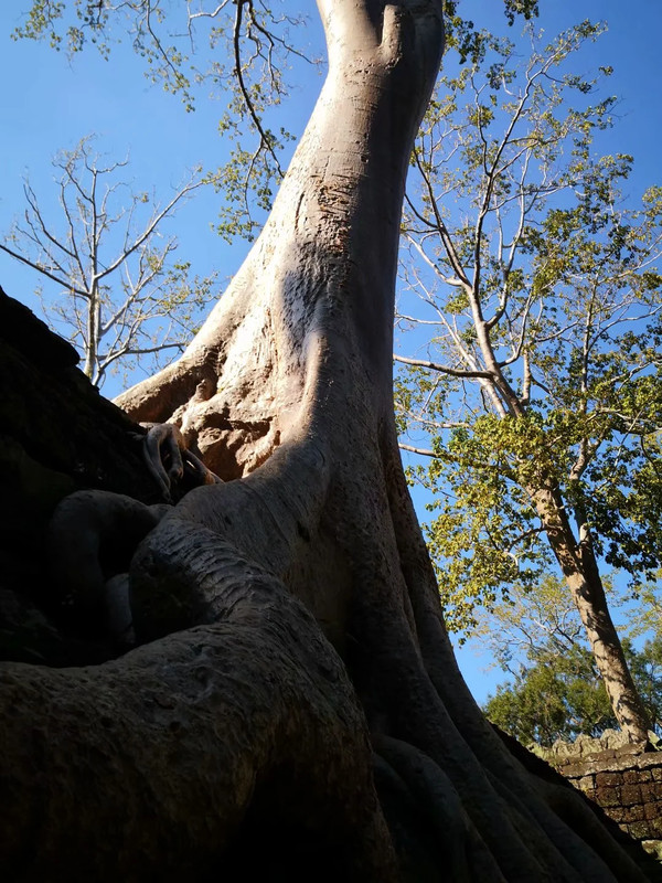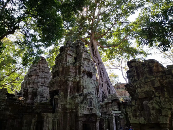 塔普伦寺是高棉国王为纪念母亲而建的庙宇和修院,这里最让人惊奇的是那种树根盘绕在寺中建筑的石壁或墙上,树干似乎从石头长出,直插空中的树,这种树导游告诉我们叫金银树。因为有这些树,使得这个寺的景色神秘而独特,这里也被电影公司选做一些电影的拍摄地和取景地。柬埔寨属于亚热带雨林气候,各种树木生长繁茂,有很多珍贵树木,我们寺中看到了几株著名的黄花梨,已经长的很高大了。