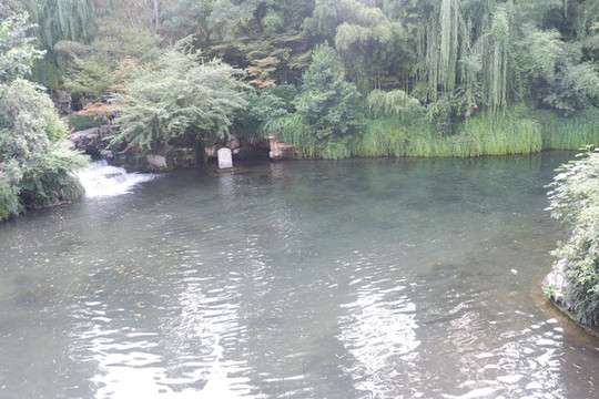 石湾泉是用太湖石砌成的不规则的水湾,泉水也比较温和,所以春天的石湾泉看上去格外美丽,泉水中倒映着泉边众多盛开的鲜花和掩映在绿树丛中古色古香的白雪楼,更显得幽雅文静。
