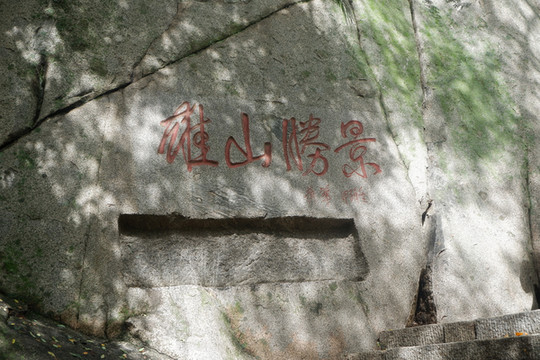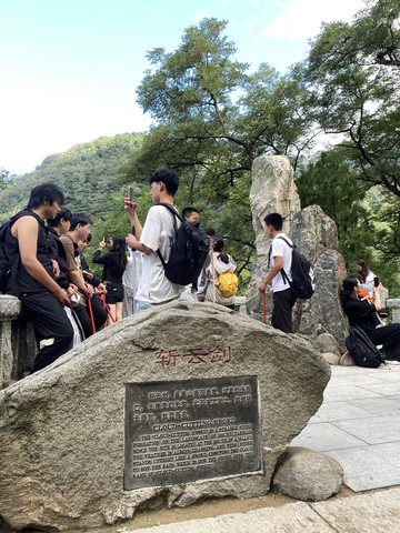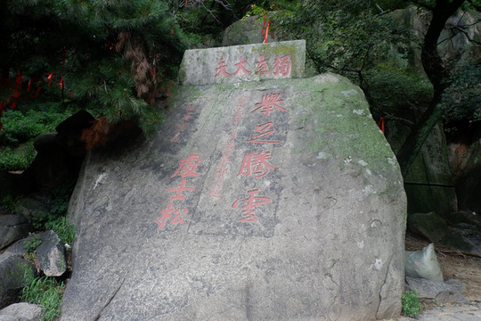 斩云剑:增福庙往上有巨石挺立,似剑凌空,上刻“斩云剑”。此处是谷口,云雨变幻莫测,泰山主峰的寒云顺谷而下时与暖云相遇即化为雨,因此而得名。