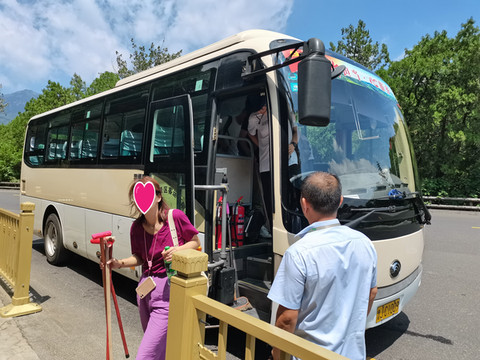 进门安检后,排队坐景交车,我们买的门票包含了往返景交车的车票,三大一小合计392元。