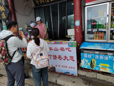 在泰山顶,看到山东最著名的美食:山东煎饼卷大葱,10块钱一个,价格倒不贵。因为昨晚在天外村已经品尝过,对这么坚韧的煎饼,确实欣赏不来,今天没有尝试!